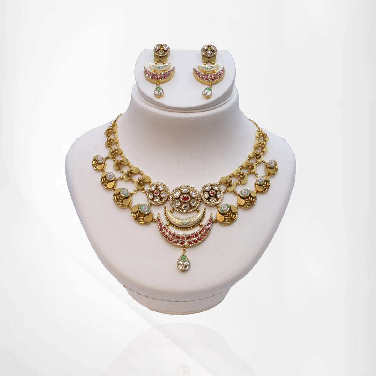 Embrace elegance and celestial charm with this antique-style moon-inspired jewelry set. Expertly crafted, the set features Kundan, Ruby, Emerald, and Cubic Zirconia stones, arranged to create a harmonious and luxurious design. The earrings are uniquely shaped to resemble a crescent moon, complementing the set’s sophisticated aesthetic. Perfect for weddings, festive occasions, and special celebrations, this set combines traditional craftsmanship with a contemporary, regal appeal. SKU-5461