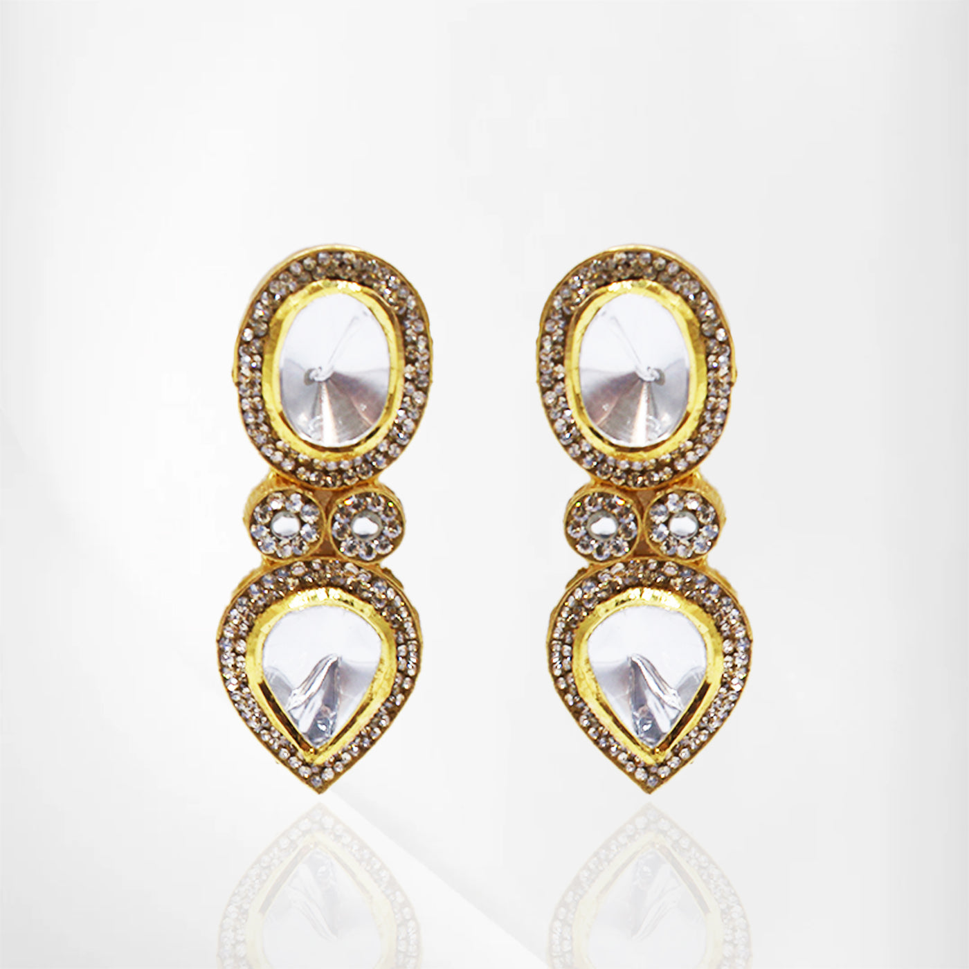 This special collection Kundan set combines timeless elegance with a touch of pearls. The necklace is designed in layers for a striking effect: the first layer features oval-shaped Kundan set with sparkling cubic zirconia, highlighting a larger centerpiece with smaller stones on each side. The second layer showcases water-drop Kundan surrounded by cubic zirconia, mirroring the balanced design of the first layer. The matching earrings feature a round Kundan at the top, flowing into a water-drop design adorned with cubic zirconia, perfectly complementing the necklace. Ideal for weddings, festive occasions, and family celebrations, this set exudes traditional charm with modern sophistication. SKU-5453