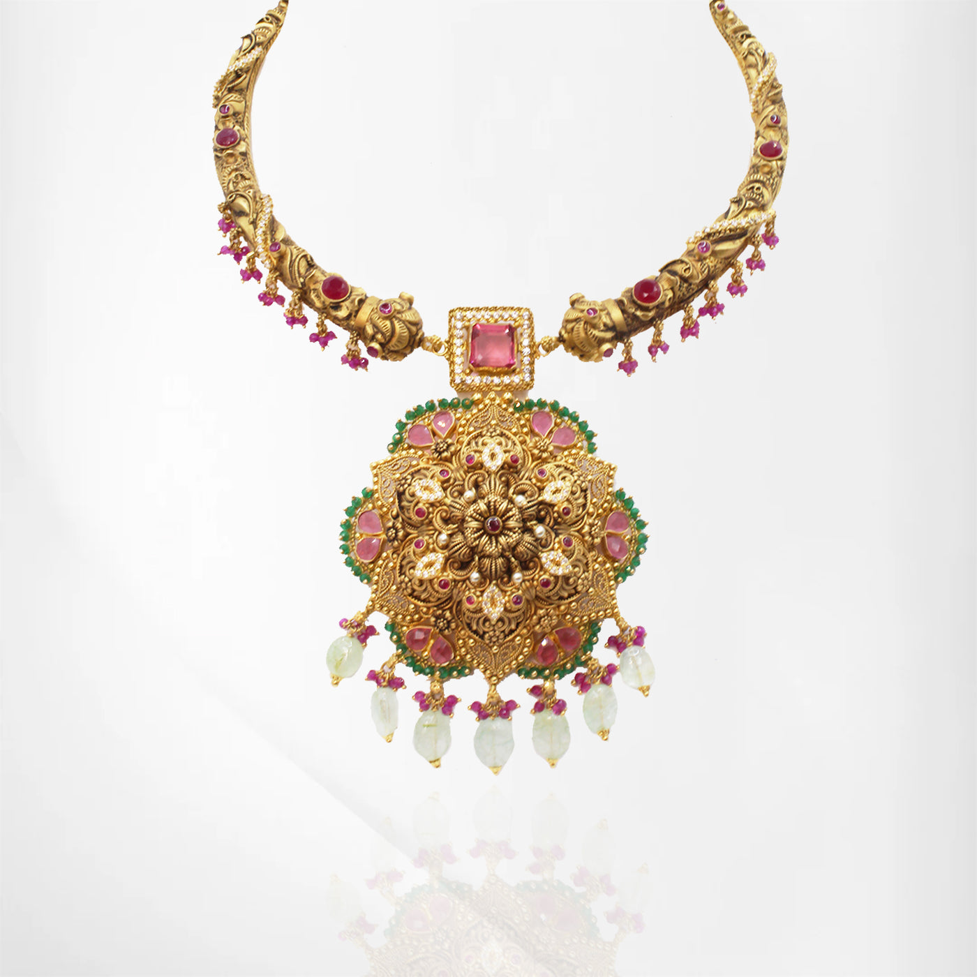 This exquisite antique Hasli/Kante-style set blends tradition with elegant craftsmanship. The centerpiece showcases a round Rose Quartz stone encircled with sparkling cubic zirconia, seamlessly flowing into a pendant featuring a delicate floral design adorned with green and pink pearls. Hanging pearls add graceful movement, while the top of the Hasli is decorated with intricate detailing.