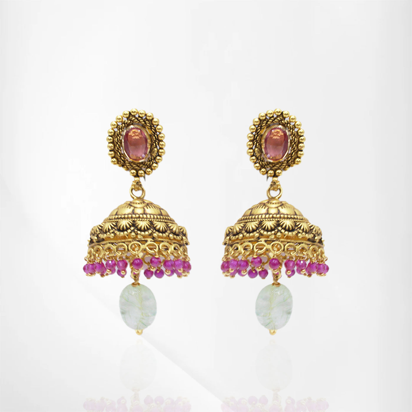 The matching earrings feature a Rose Quartz at the top, flowing into a floral-inspired design with pink hanging pearls, perfectly complementing the pendant. Ideal for weddings, festive celebrations, and family gatherings, this set offers a timeless balance of heritage, artistry, and elegance. SKU- 5483