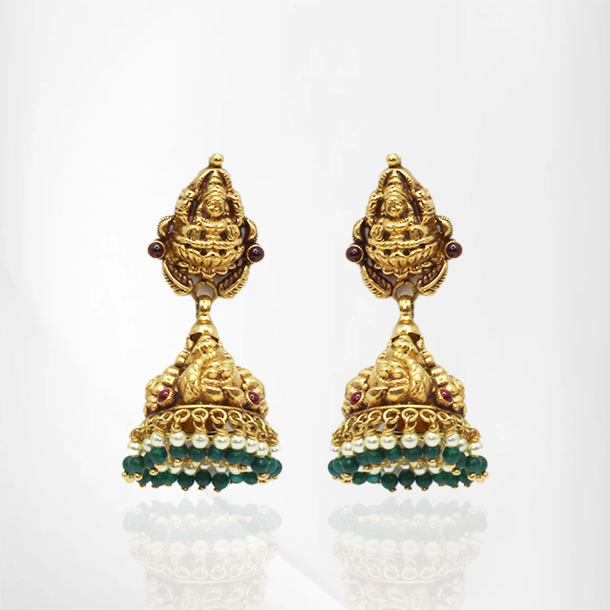 Celebrate tradition and divine elegance with this antique-style chain set, meticulously crafted to honor Goddess Lakshmi and the beauty of peacocks. The chain features alternating pendants of Lakshmi and peacock motifs, each highlighted with a central green pearl and surrounded by delicate white pearls, adding a devotional and luxurious touch. The matching earrings showcase a Lakshmi idol at the top, flowing into a butta design intricately detailed with peacock and floral patterns, finished with hanging green and white pearls. Ideal for weddings, festive occasions, and auspicious celebrations, this set combines artistry, cultural symbolism, and timeless elegance in a truly breathtaking ensemble. SKU-1611