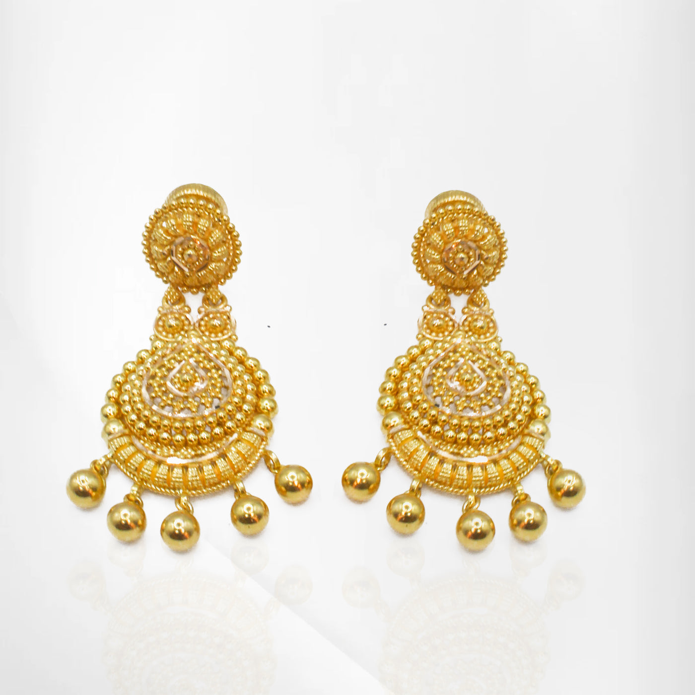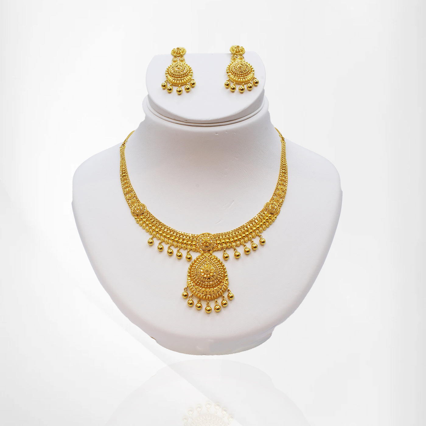 Make a bold and graceful statement with this exquisite short gold set, crafted in yellow gold. The necklace features a beautifully detailed central pendant adorned with dazzling gold balls that cascade delicately below, creating a sense of movement and brilliance. The matching earrings mirror the same design, with delicate gold ball accents that enhance the harmony and sophistication of the set. Perfectly balancing tradition and contemporary style, this set is ideal for weddings, festive occasions, or any special celebration, offering timeless elegance that captivates at every glance. SKU-4985