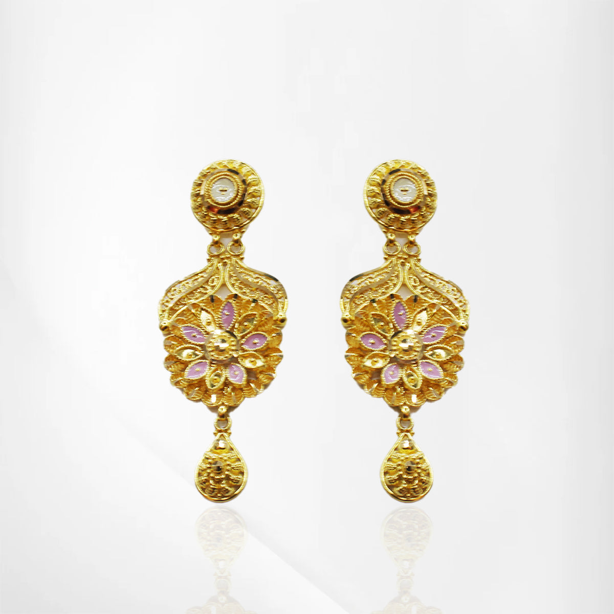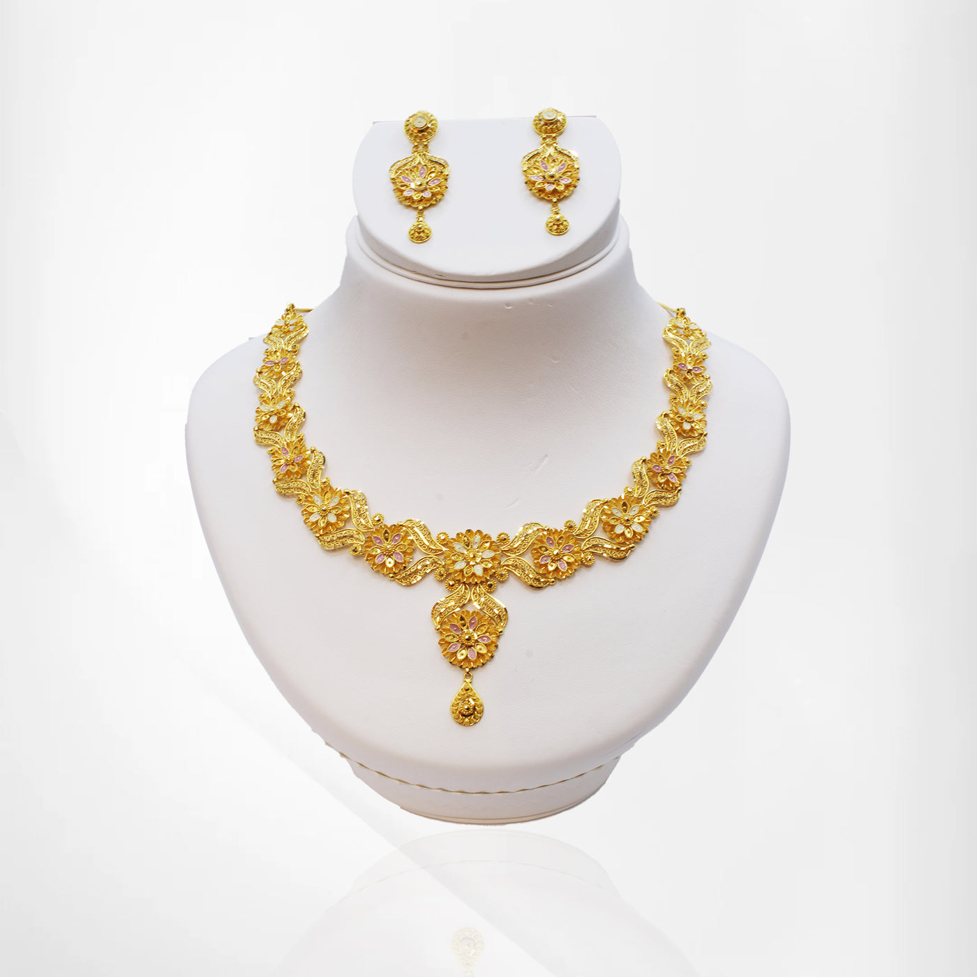 Embrace timeless beauty with this exquisite yellow gold short set, featuring intricate floral craftsmanship. Each delicate flower is adorned with white and light pink enamel, beautifully intertwined with leaf-inspired motifs that flow throughout the set. Designed to celebrate the harmony of tradition and nature, this set includes perfectly matching earrings, making it an ideal choice for festive occasions or special celebrations. A perfect blend of elegance, artistry, and cultural charm. SKU-3746