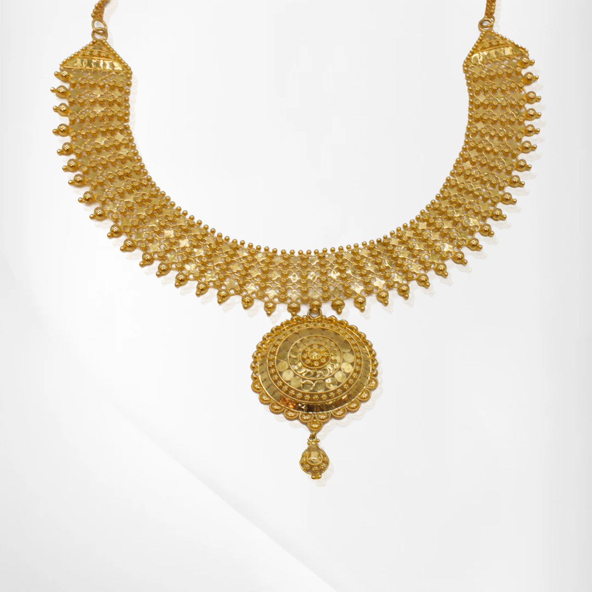 Our Beautiful Yellow Gold Special Chandrahar Set is a true celebration of tradition and artistry. Designed in a unique and rare style, this elegant set features a striking pendant inspired by the brilliance of the stars, perfectly paired with matching earrings to create a complete and harmonious look. The rich yellow gold finish highlights its intricate craftsmanship, while the distinctive Chandrahar design represents heritage, beauty, and timeless charm. This exclusive set is created for those who appreciate cultural elegance with a luxurious, statement-making presence. SKU-5027