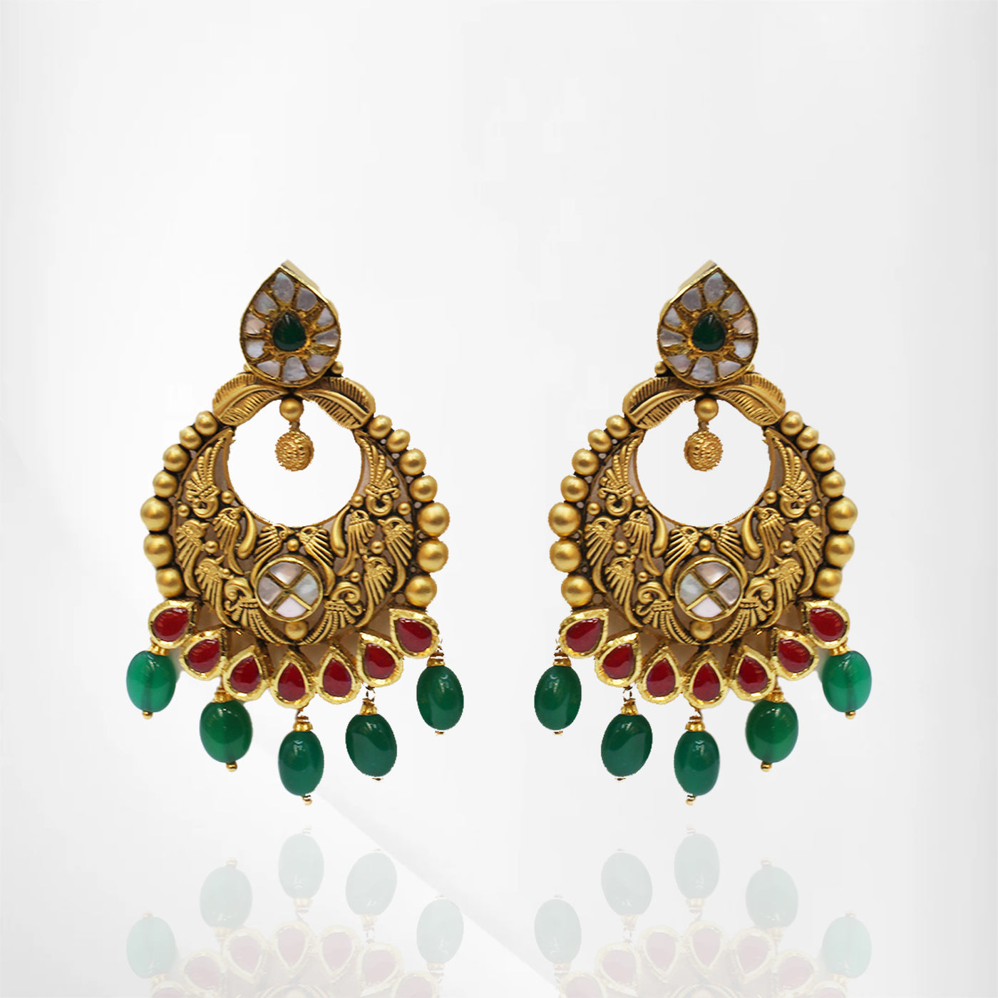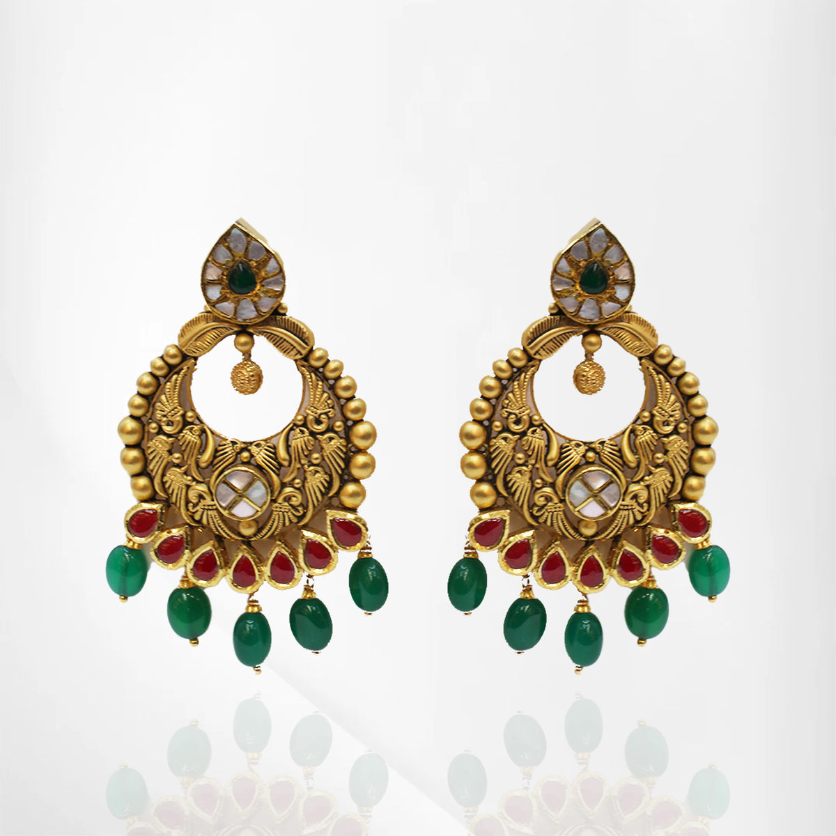 This exquisite antique bridal choker set is inspired by celestial elegance, designed to create a heavenly look. The centerpiece features a large floral motif, beautifully aligned with delicate leaf and drop designs, adorned with Kundan and Ruby stones. The choker incorporates Chandbali-style elements, adding a touch of royal charm. The matching earrings feature a top Kundan design flowing into Chandbali-inspired motifs with intricately crafted leaves and florals, completed with hanging green pearls for graceful movement. Perfect for weddings and special occasions, this set blends traditional craftsmanship with elegance, making it a standout bridal statement piece. SKU-5507